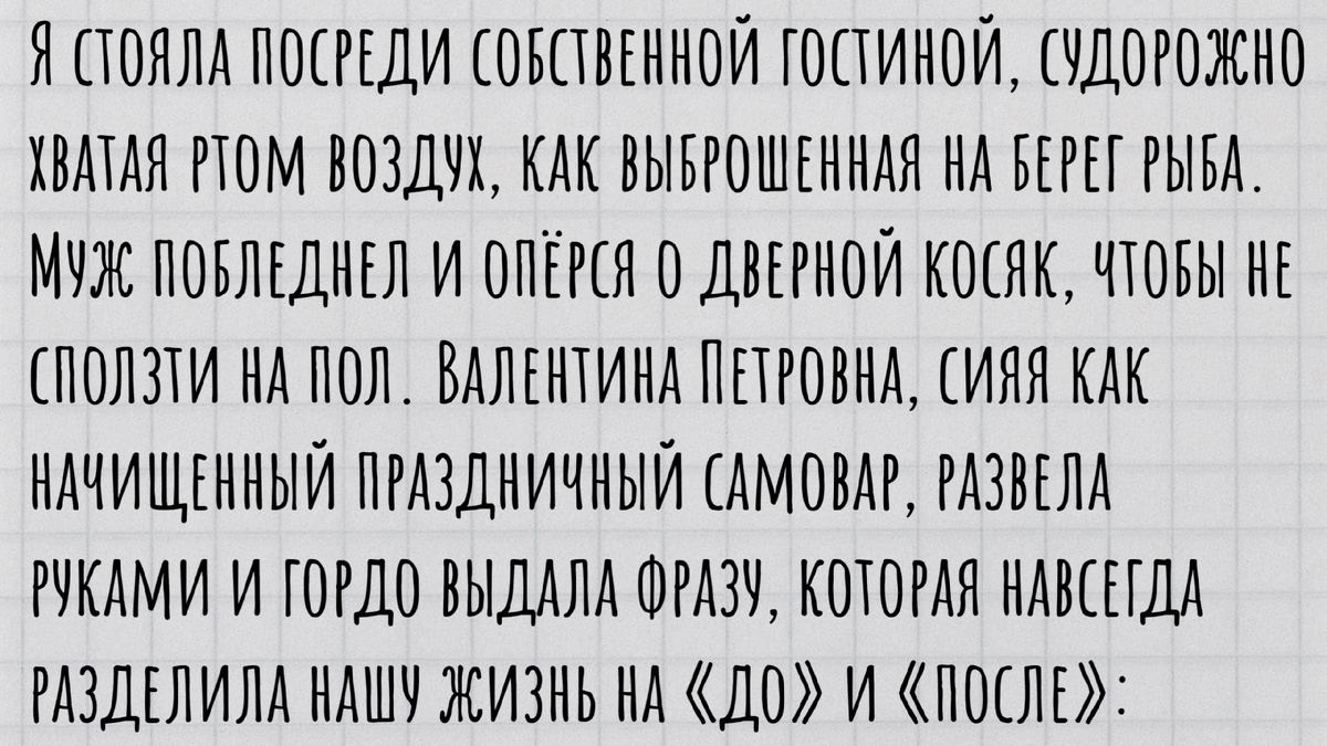 Я стояла посреди собственной гостиной, судорожно хватая ртом воздух, как выброшенная на берег рыба. Муж побледнел и опёрся о дверной косяк, чтобы банально не сползти на пол. Валентина Петровна, сияя как начищенный праздничный самовар, развела руками и гордо выдала фразу, которая навсегда разделила нашу жизнь на «до» и «после»: