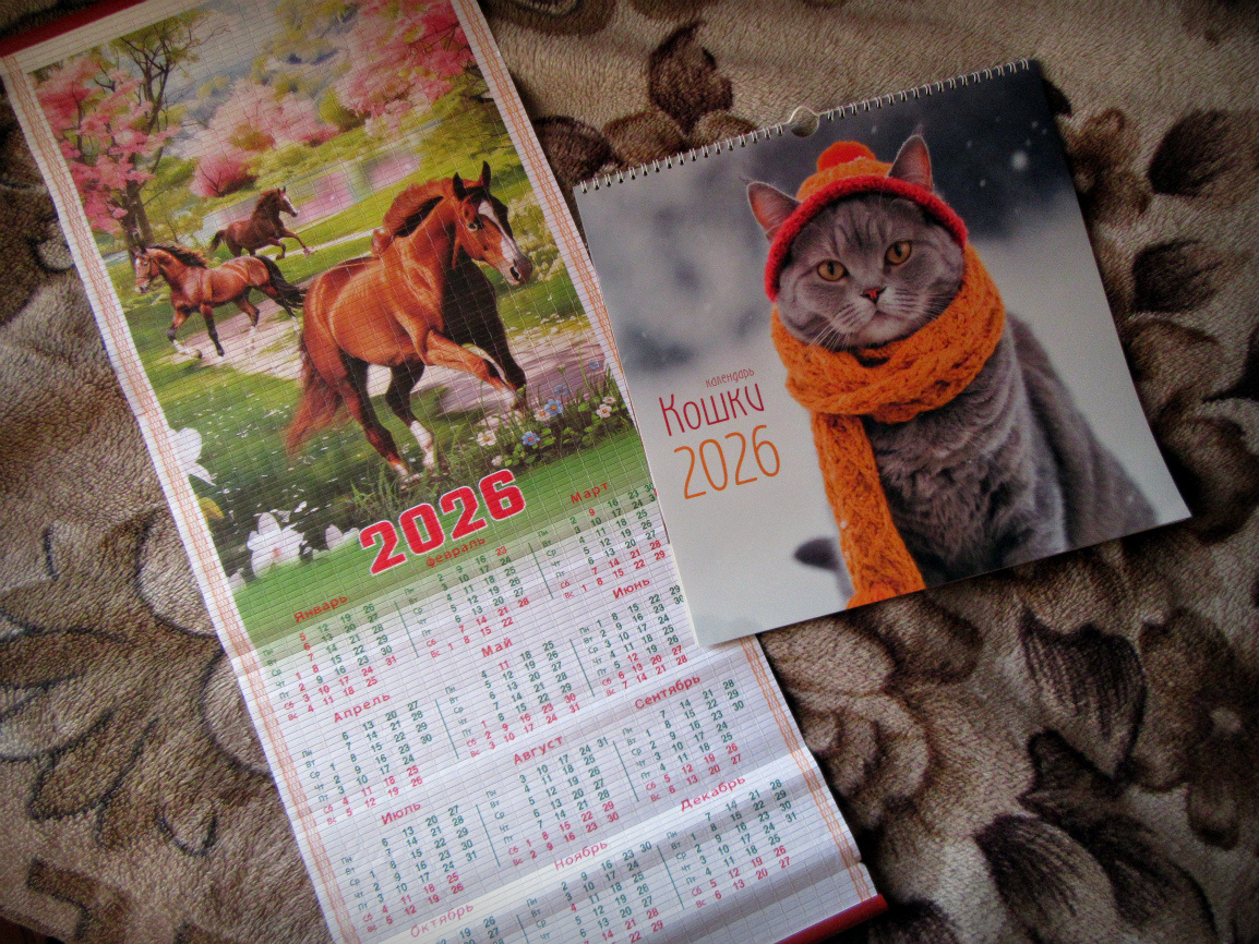 Здравствуйте, дорогие читатели! Собиралась сделать подборку фотографий в последний день месяца, как чаще всего и бывает, но картиночки набрались уже сейчас, так что не буду ждать 31-го числа. Может, там ещё что-то наберётся, а пока вспомним прошедшие праздники, первые дни 2026 года и посмотрим снежные сюжеты. Что у нас там с календарями? А вот что: традиционный кошачий с симпатичными мордочками на каждый месяц и просто подвесной с лошадками на весь год. А здесь уютное зимнее чаепитие. С добытой в морозильнике викторией (клубникой) - аромат-то какой!)) И ещё меня умиляет новый заварник "Котейка". В "Галамарте", где я его купила, была целая серия посуды с таким названием и с забавным рисованным длиннохвостым котиком, но я ограничилась только заварником, где этот персонаж изображён восседающим на велосипедном багажнике))) А январь у нас довольно холодный... По-моему, даже фотографии передают этот холод: кружево инея, яркие краски неба, заснеженный мир... Коллекцию птичьих портретов в это
