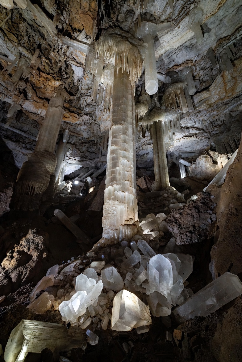 За стеной открылась камера длиной около 109 метров, шириной 10 метров и высотой до 30 метров. Пол, стены, потолок — всё усеяно идеально прозрачными кристаллами селенита (CaSO₄·2H₂O), прозрачной разновидностью гипса. Самый большой — 11,4 метра в длину, 4 метра в диаметре, весом 55 тонн. Другие — как стволы деревьев из стекла, пересекающие пространство во всех направлениях.