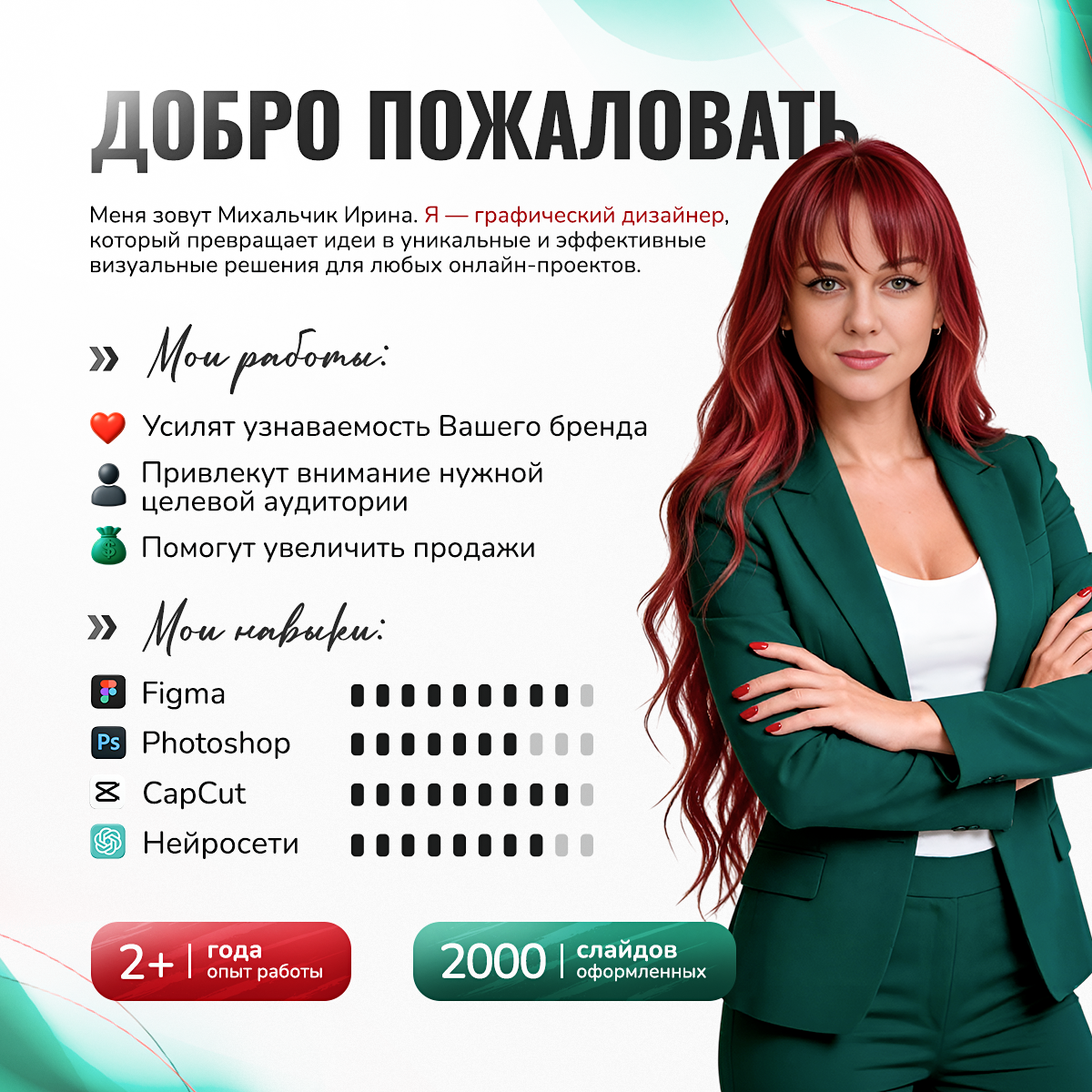 Привет. Я Михальчик Ирина, дизайнер. Помогаю экспертам, брендам и предпринимателям выглядеть профессионально, выделяться среди конкурентов и продавать через визуал. За плечами: — 2000+ оформленных слайдов — Дизайн, который помогает не просто «смотреть», а кликать, покупать и сохранять — Арсенал в 30+ нейросетей, которые экономят ваш бюджет — Ежегодное повышение квалификации — Работа с физ. и юр.лицами Моя главная цель - создать для вас дизайн, который будет работать на ваш бизнес, привлекать внимание вашей целевой аудитории и приносить прибыль. Готовы сделать ваш проект заметным? Напишите мне сейчас и 1 слайд вам будет в подарок https://t.me/Irina_Mikhalchik Подпишитесь и получите от меня бонус на первый заказ.