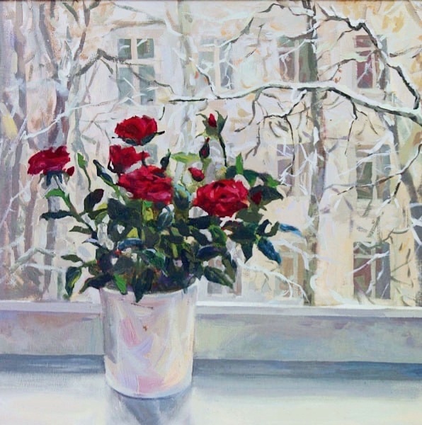 А на окне в горшочке розы