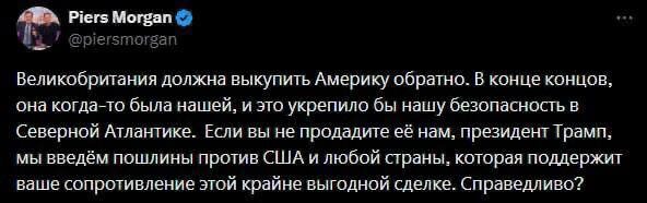Великобритания должна выкупить Америку обратно. В конце концов, она когда-то была нашей, и это укрепило бы нашу безопасность в Северной Атлантике. Если вы не продадите её нам, президент Трамп, мы введём пошлины против США и любой страны, которая поддержит ваше сопротивление этой крайне выгодной сделке. 🌐 За Русский Мир©Резервный📣Наш Чат✔️Подпишись‼️