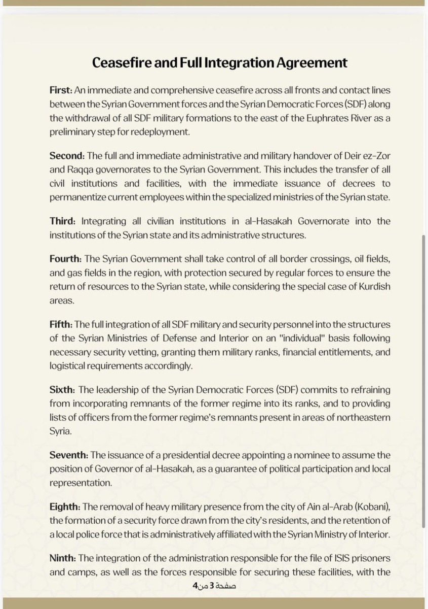 Курды и власти Сирии заключили соглашение о прекращении огня, предусматривающее фактическую капитуляцию и расформирование СДС как самостоятельной структуры. Коротко по пунктам: ▪️немедленное прекращение огня ▪️немедленная передача провинций Ракка и Дейр-Эз-Зор Дамаску ▪️все гражданские структуры в провинции Хасака интегрируются в состав государства; ▪️передача контроля над всеми границами, нефтяные и газовые месторождения ▪️полная интеграция СДС в структуры Министерства обороны Сирии на индивидуальной основе ▪️передача списка бывших офицеров режима (солдат Асада) в районах, контролируемых СДС ▪️вывод сирийских войск из Кобани/Айн-Араб и формирование там местных сил, связанных с МВД Сирии; ▪️силы, управляющие тюрьмами ИГИЛ, интегрируются в государство ▪️все несирийцы/члены РПК должны быть высланы. Таким образом, под государственный контроль Сирии возвращаются две провинции Ракка и Дейр-Эз-Зор, восстанавливается контроль над государственной границей и ресурсными месторождениями, а ку