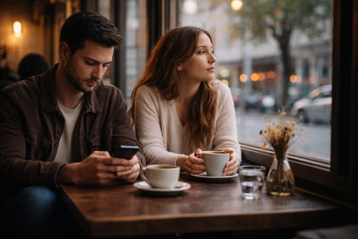 Они сидели рядом, настолько близко, что локти иногда соприкасались, и это было почти незаметно. Можно было уловить тепло — не телом даже, а чем-то глубже, кожей. И при этом они были в разных местах. Я заметила это случайно, в кафе, где шум всегда одинаковый: чашки, голоса, шаги, негромкая музыка. Они сидели за маленьким столом у окна. Он смотрел в экран телефона, время от времени пролистывая что-то привычным движением пальца. Она смотрела в окно, туда, где люди спешили по своим делам, не зная, что за ними наблюдают. Иногда он что-то говорил, а она кивала, иногда улыбалась. Но улыбка была такой… аккуратной. Будто нужной не ей, а ситуации. И вдруг стало ясно: между ними не расстояние. Между ними время. Он был в своих мыслях о завтрашнем дне, задачах, делах, планах. Она — в воспоминаниях о том, что уже не вернётся, но всё ещё болит где-то внутри. Их тела делили один стол, одну чашку сахара, один вид из окна. А внутренне они находились в разных комнатах, а может, и в разных городах. Это бы