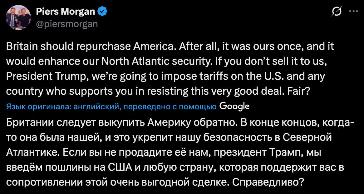 ? «Британия должна выкупить Америку обратно», — поглумился над Трампом журналист Пирс Морган. Британец добавил, что это была бы «очень выгодная сделка». Готовы скинуться всем миром! 😁 👍«БайБайден» в МАХ