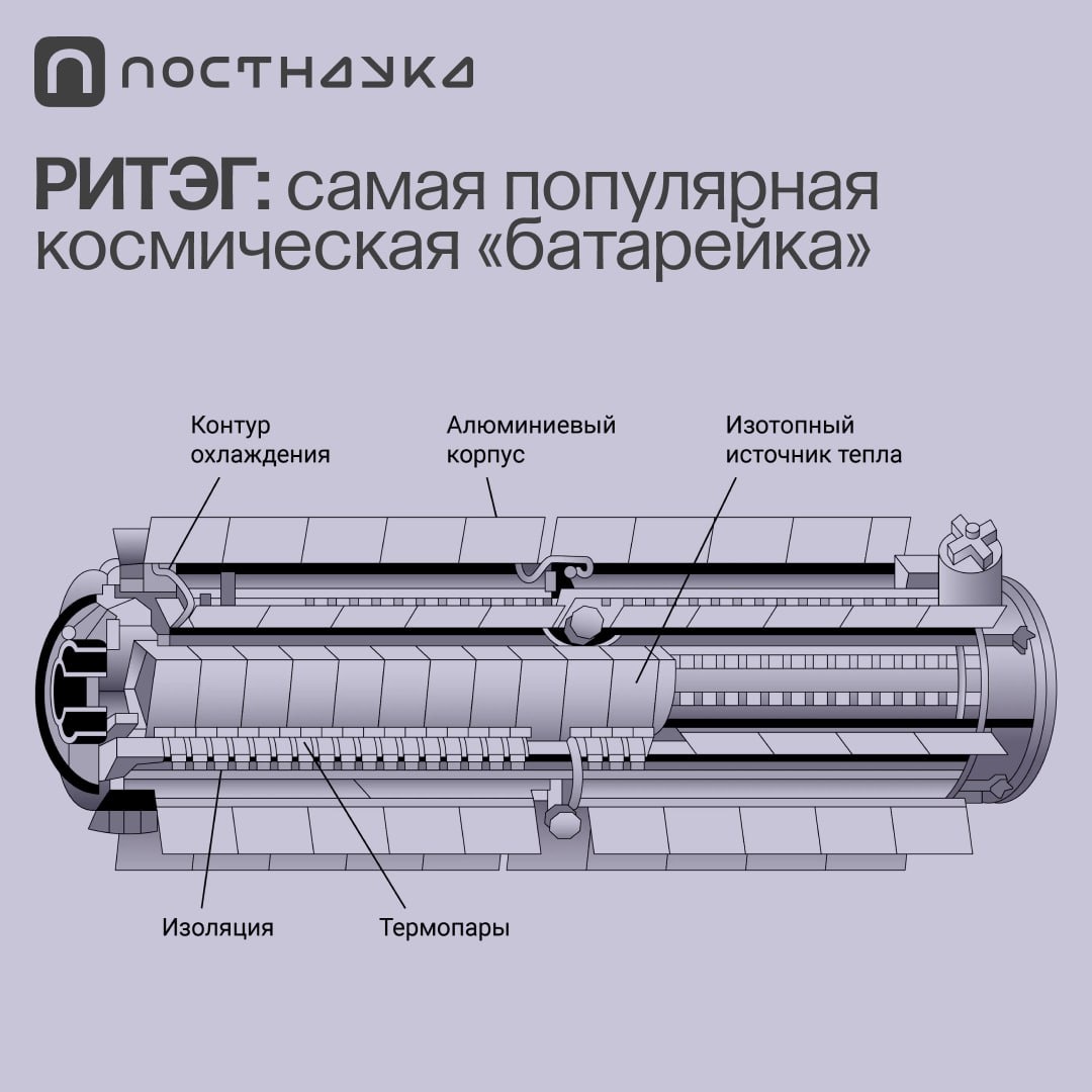 изотопов в электричество. Преимущественно РИТЭГ состоит из двух основных компонентов: источника тепла, содержащего радиоактивный изотоп, и твердотельных термопар, преобразующих тепловую энергию распада радиоактивного элемента в электричество. То, что распад изотопов происходит самостоятельно, означает, что генератором нельзя управлять. После загрузки топлива он будет нагреваться и производить электричество годами, постепенно деградируя. Наиболее важную роль РИТЭГ играют при освоении космоса. Они питали практически все «Пионеры» и «Вояджеры», различные космические зонды и марсоход Curiosity. 211 публикаций о космосе