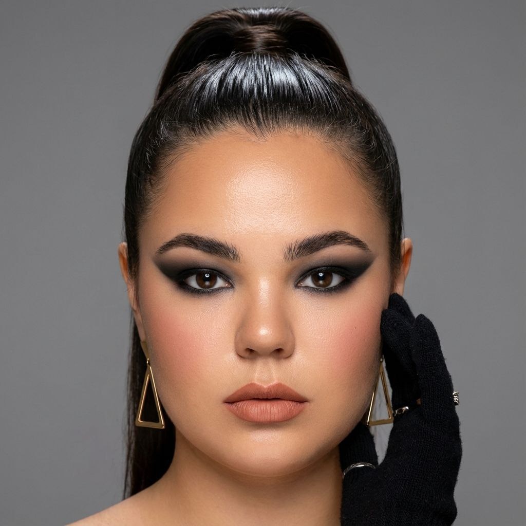 : Создайте высококачественный фронтальный портрет фотографии женщины на фоне гладкого, нейтрального серого цвета среднего тона. Не меняй черты лица Объект должен занимать примерно 80% вертикальной рамки, с высоким, гладким хвостом, сделанным из прямых волос, отражающим блестящую поверхность. Тон кожи теплый, средний бежевый с легкими золотыми оттенками, с гладкой текстурой и легким естественным блеском. Черты лица должны быть выраженными с густыми, темно-эспрессо коричневыми бровями, широко посаженными миндалевидными глазами с темно-коричневыми радужками, отражающими блеск. Макияж глаз драматичный с градиентом от глубокого матового черного до темного угольного серого и эффектом «кошачий глаз». Щеки должны иметь теплый розовый румянец, а губы должны быть полными, окрашенными в матовую терракотовую нюдовую помаду. Правая рука в черной вязаной перчатке должна быть поднята к лицу, с кольцами на пальцах. В ушах большие треугольные серьги золотые .Освещение мягкое и фронтальное, минимизиру
