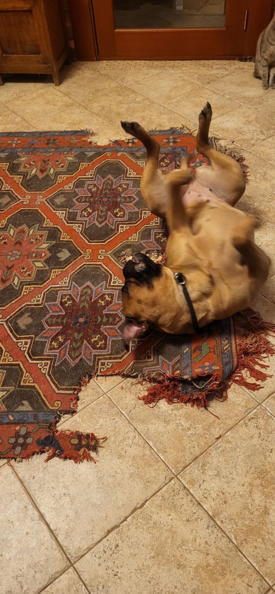 Сожрала ковер и теперь радостно валяется на его огрызках... Пытается догрызть))