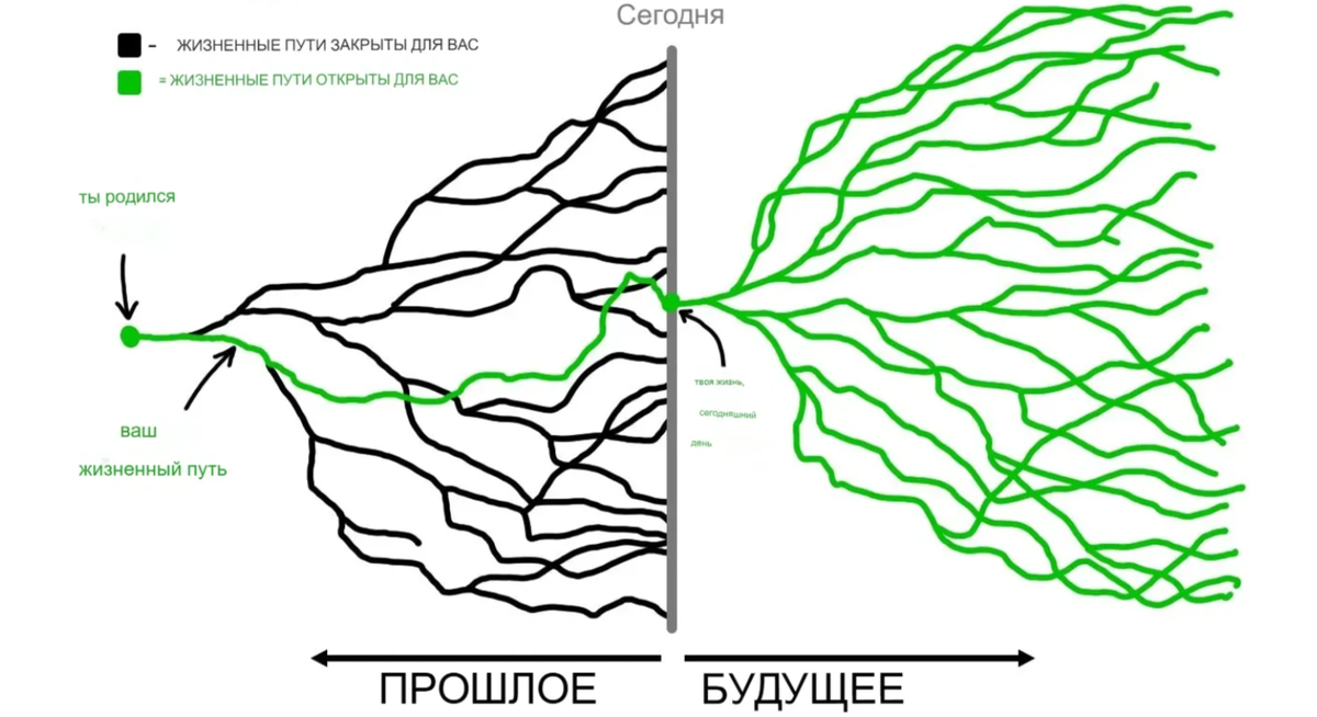 Каждый момент нашей жизни определяется выбором — осознанным, случайным или сделанным за нас. На изображении выше прекрасно отражена эта истина: наше прошлое определяет, где мы находимся сегодня, но наше будущее остаётся открытым, предлагая бесконечные возможности. В этой статье мы рассмотрим, как эта диаграмма «жизненного пути» отражает наш путь личностного роста, почему ваше будущее всё ещё открыто и как осознанно формировать его, начиная сегодня. Это мощное напоминание: «Прошлое неизменно, но будущее бесконечно». Левая часть изображения символизирует ваше прошлое — ту часть жизни, которая уже прожита.