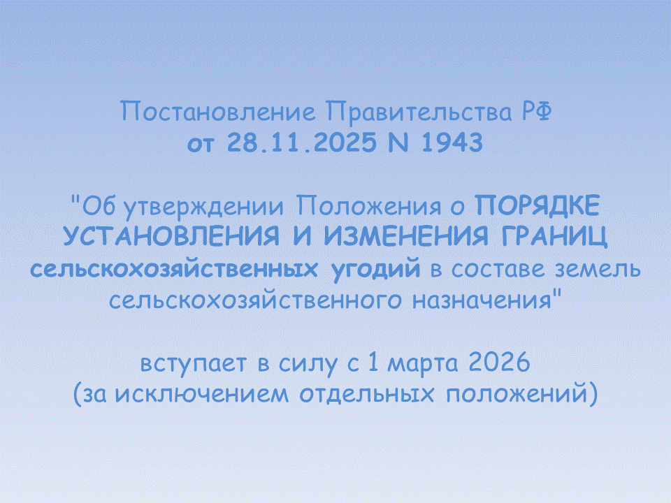 - Порядок установления и изменения границ сельскохозяйственных угодий в составе земель сельскохозяйственного назначения (Постановление Правительства РФ от 28.11.2025 N 1943);