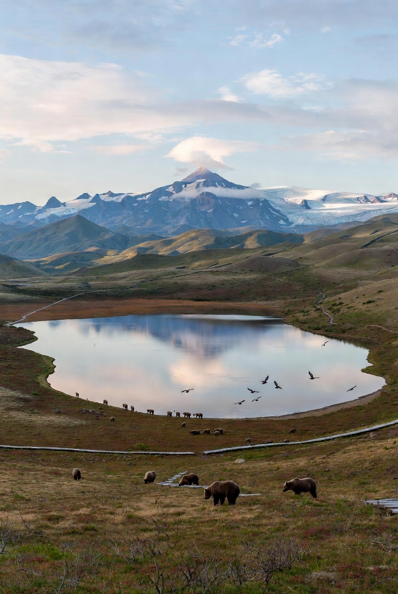 Здесь нет бурлящих гейзеров Долины (она в 30 км севернее), нет адского жара и запаха серы. Вместо этого — тишина, прерываемая только криками чаек, плеском рыбы и далёким гулом ветра. Вода такая прозрачная, что видно дно на десятки метров. Вулкан Кроноцкий (3528 м) стоит на востоке, как страж, и его отражение в озере выглядит так идеально, будто кто-то нарисовал его циркулем. Ощущение — будто ты попал в центр огромной природной картины, где время замедлилось, а планета показывает своё самое спокойное, но самое глубокое лицо.