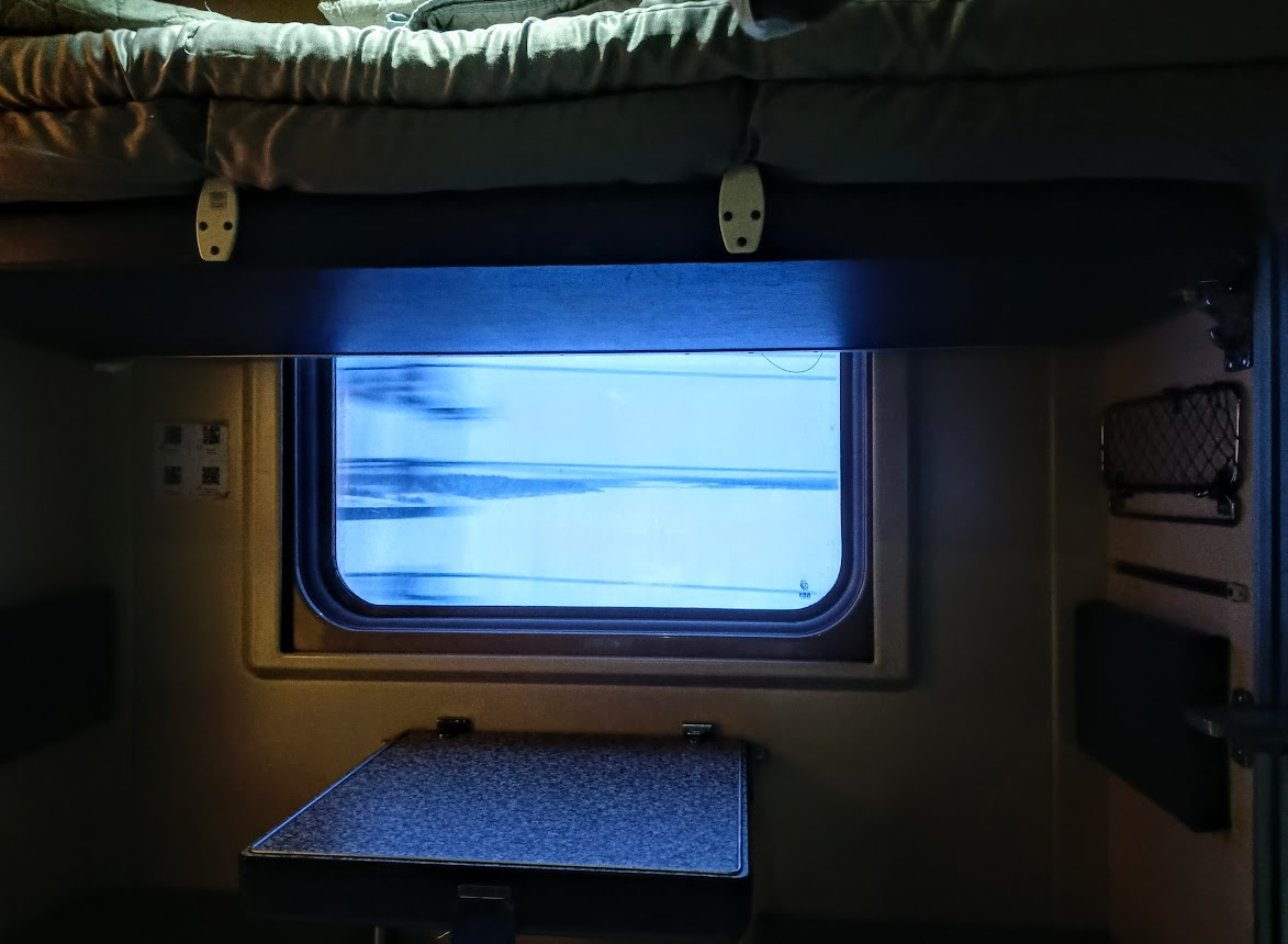 Проснулась в 8.30, в окошке напротив, сменяя друг-друга, мелькали черно-белые картинки. В вагоне полумрак и тишина, едем полупустыми, что конечно хорошо учитывая что на два вагона остался всего один работающий туалет.