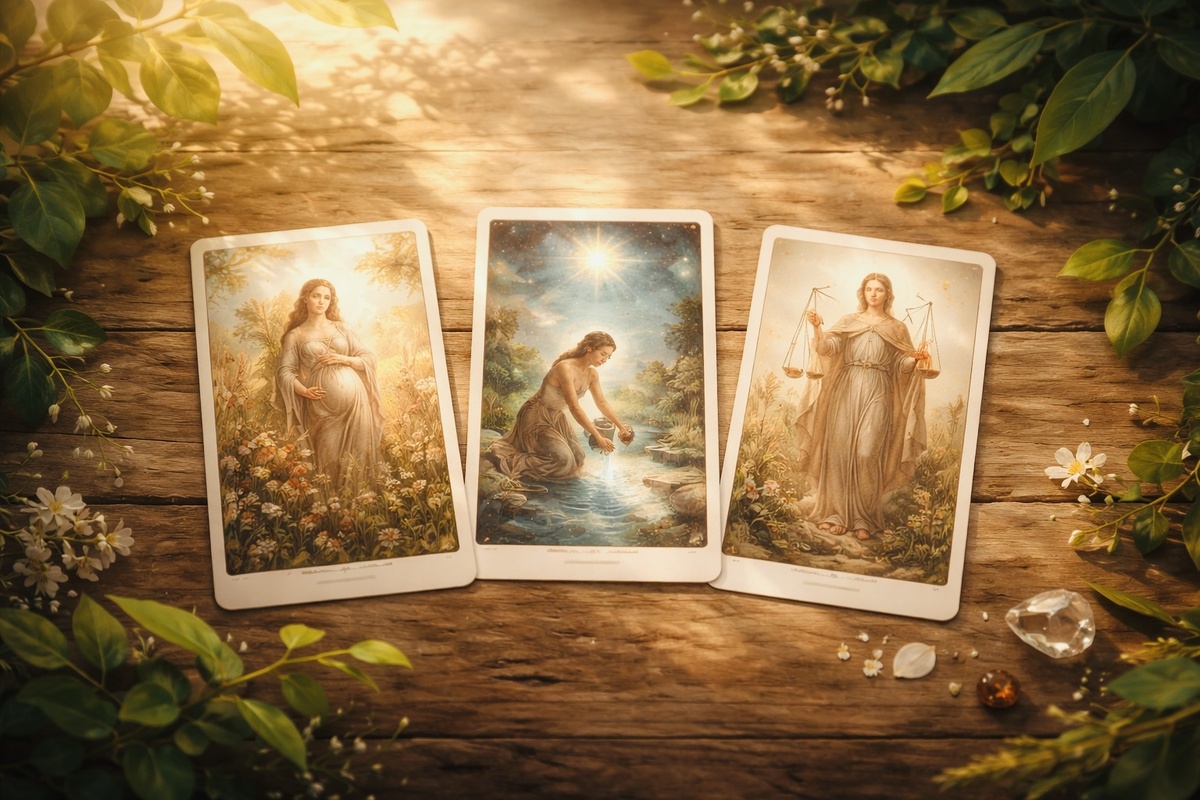 Первая карта показывает прошлое, то, что стало фундаментом для всего, что происходит сейчас. И здесь появляется образ, наполненный теплом, изобилием, творческой силой и глубокой женской энергией — энергией создания, вынашивания, заботы о том, что дорого сердцу.
