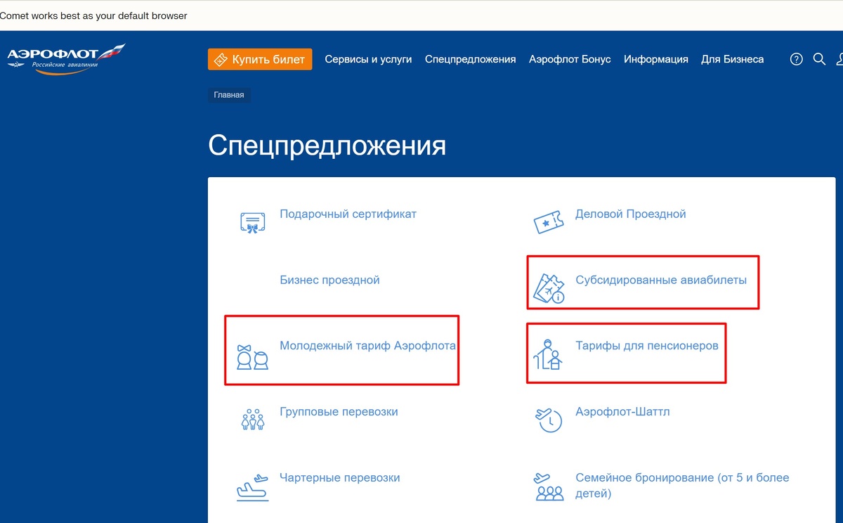 На сайте Аэрофлота в разделе спецпредложений есть отдельные вкладки: «Молодёжный тариф», «Тарифы для пенсионеров», «Субсидированные авиабилеты», а также «плоские» тарифы на Дальний Восток и Южно-Сахалинск по фиксированной цене.