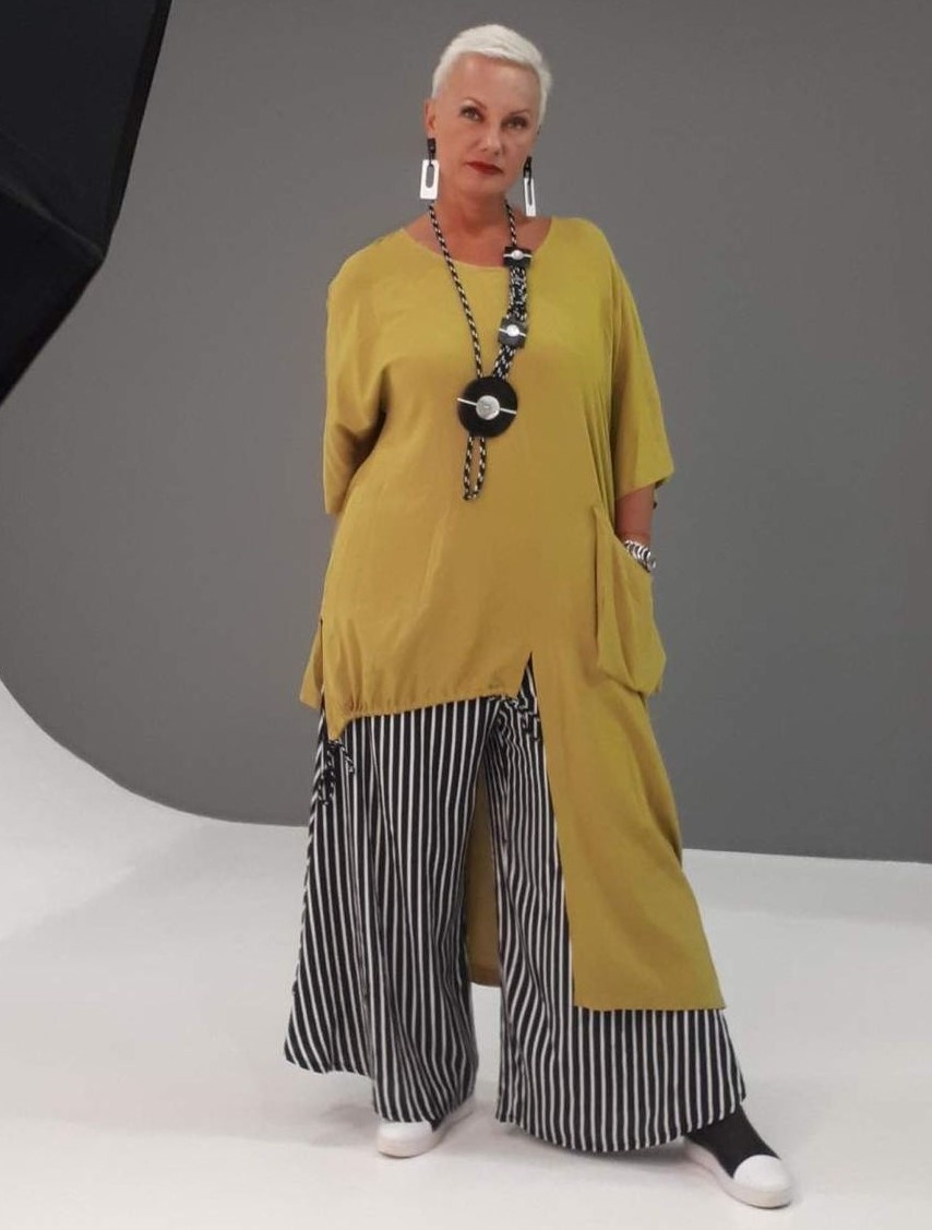 Гардероб в стиле бохо предполагает наличие вещей, выглядящих свободно, выполненных из легких струящихся тканей в нейтральных цветах. Стиль бохо молодит и освежает, поэтому он идеально подходит женщинам старше 60, желающим выглядеть ярко, но не утруждать себя сложной стилизацией. При этом стиль бохо – это не только разнообразные туники и бесформенные балахоны, но и оригинальные юбки, платья, блузки и брюки. 1. Кремово-бежевая блузка трапециевидной формы с воротником-хомутом и длинными свободными рукавами, подвернутыми, чтобы открыть запястья, а также с небольшим накладным карманом в самом низу – оригинальная вещь в стиле бохо, которая заметно освежит образ зрелой женщины. Хороший ансамбль с такой блузкой составляют зауженные белые брюки как лаконичная база для эффектного образа. 2. Яркое желто-оранжевое многослойное платье асимметричного кроя выглядит очень сочно и насыщенно. Модель выглядит заметно благодаря декоративным швам и крупным накладным карманам, а также благодаря нижнему слою