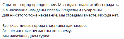 Наткнулся совершенно случайно на высказывание одной местной блогерши о Саратове. Так может написать только мазохист. Почему? Потому что если все так плохо в городе, в котором ты живешь, то уезжай! Или не можешь? Она может, поверьте мне, я знаю это точно. Но не хочет. Не хочет, но живет и ругает. Мой город. Наш город. В Саратове живут разные люди, я понимаю. Но каждый раз, когда попадается ... вот такой кадр, это задевает. Мой родной Саратов для меня всегда хороший, какой бы не была в городе власть, кто бы не руководил им. Потому что хорошесть зависит не только от власти, как считают некоторые, а от нас с вами. Не мусорить, не плеваться, не бросать окурки мимо урны, не расписывать граффити на стенах и окнах, поднимать мусор, не толкаться в очередях, не сквернословить и открывать дверь перед тем, кто идет за вами с руками, в которых сумки. В этом тоже виновата власть? А мы нет? Хорошо устроилась! Мне тут написал один подписчик: "Ну, что вы хотите, Алексей, эта блогерша иноагент. А от ни