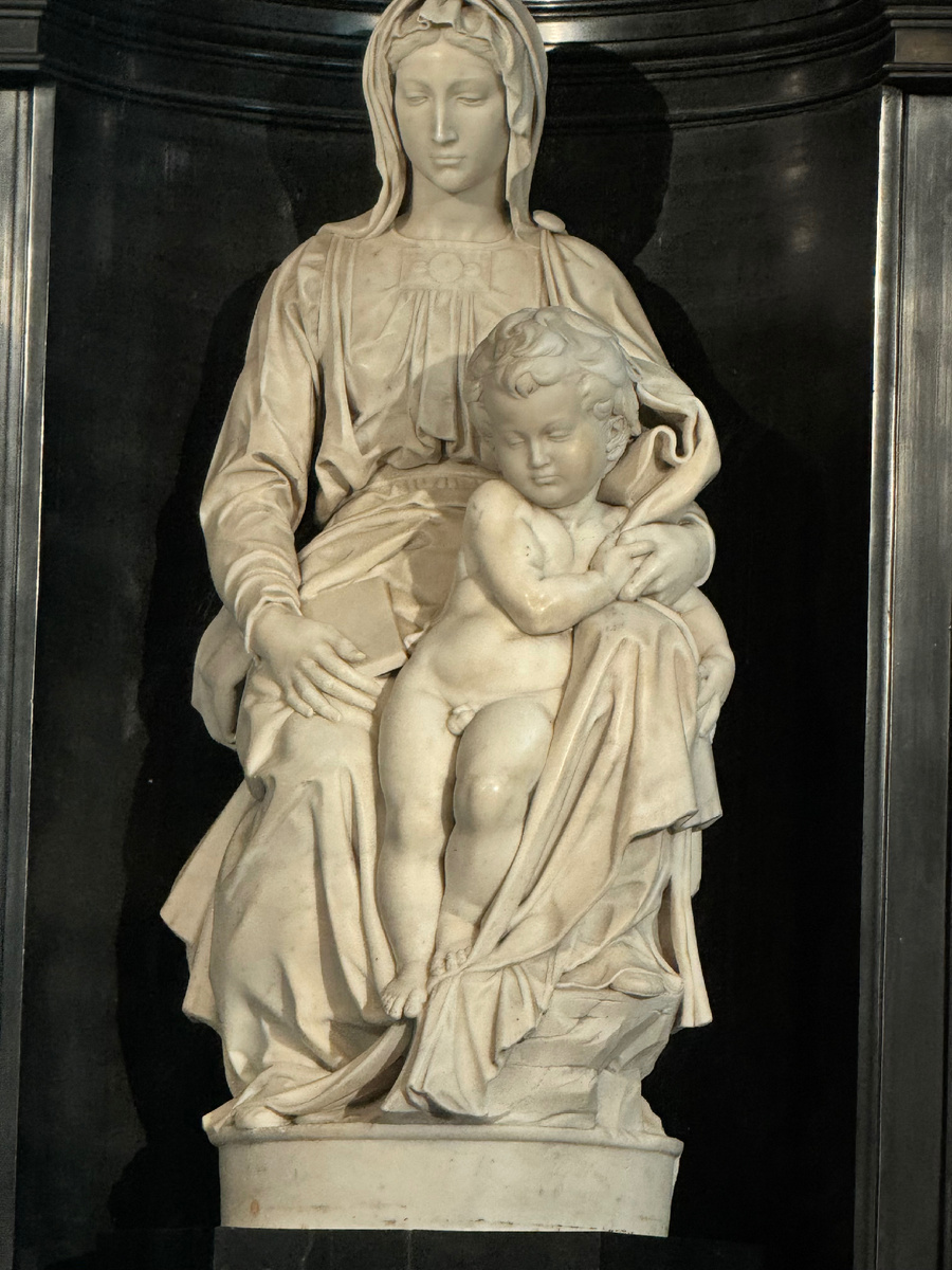 Мадонна с Младенцем» Микеланджело Буонаротти — одно из немногих произведений мастера , покинувших Италию, да еще и при жизни скульптора. Братья Мусскрон, торговцы тканями из богатой брюггской семьи, заказали эту работу за внушительную сумму в 100 дукатов — что равнялось