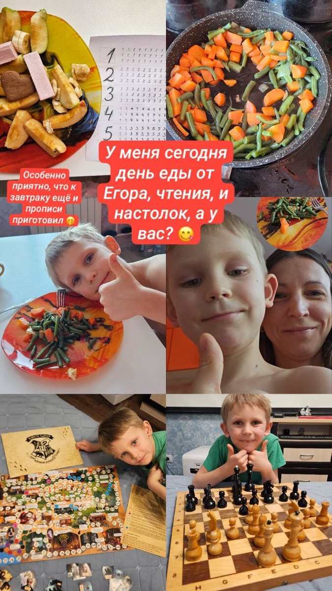 Но мы не замечаем, и "не берём" то, что они щедро дают взамен. Егор сегодня мне приготовил на завтрак: фрукты, печеньку сердечком (раньше пекли с ним), пастилу, и прописи свои.😉 А на обед потушил лук, морковь и фасоль. Очень вкусно вышло, впрочем как всегда и всё у него, т.к. он неизменно добавляет секретеый ингредиент - любовь. Он сам так говорит, и это ощущается. 🥰 С Егором всегда весело, и это тоже мега ценно, от него всегда можно радостью подзарядиться, если позволить себе присоединиться к нему. Передаю его вайб в цитатах: 1. - Мам, а 60 руб - это тысяча? (я: почему ты так решил?) - Ну, 60 минут - это час, почему 60 руб не тысяча? 2. - Пап, а ты что на завтрак хочешь? (Папа отвечает: инжир) - Давай к инженеру съездим, он нам инжир даст." ❣Радостного настроения, любвиобильной еды, и кайфового баланса брать-давать и наслаждаться всем! 🧚♀ #радость_открытий@happy_family_way #диалоги_с_детьми@happy_family_way