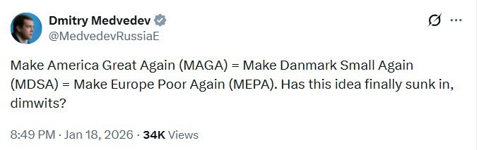 Медведев: Сделаем Америку снова великой (MAGA) = Сделаем Данию снова маленькой (MDSA) = Сделаем Европу снова бедной (MEPA). Неужели эта идея наконец-то дошла до вас, недоумки?