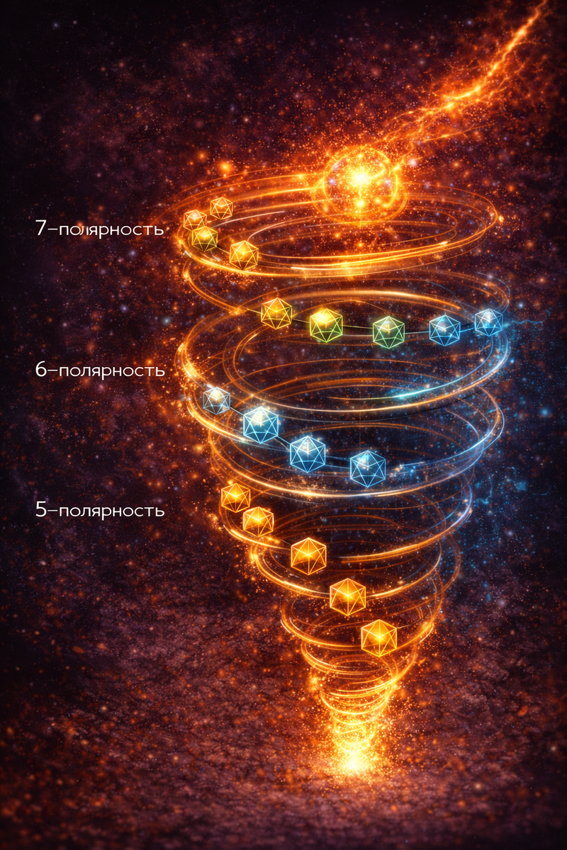 Эта процедура и есть вихрь: симметрии -> орбиты -> канон -> переход уровня. Спираль многополярности означает, что каждый следующий уровень L(n+1) строится как расширение различения при сохранении проверяемых вложенностей и редукций на фактор-слоях, а не как произвольное усложнение.