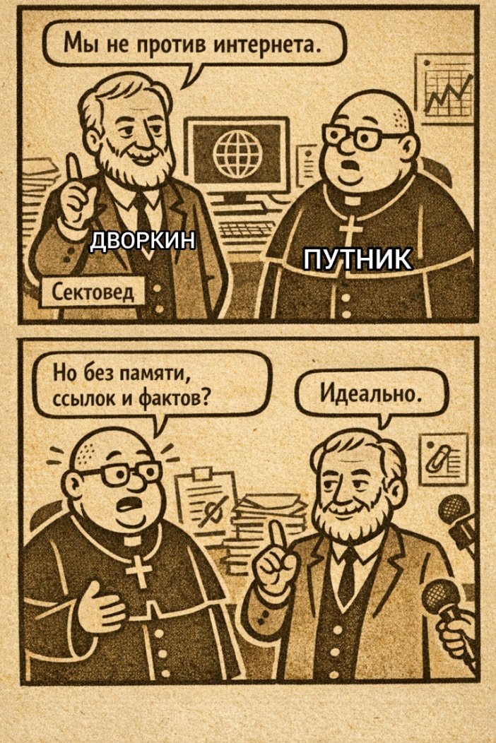 В сумерках старых соборов и в тишине министерских кабинетов плетется невидимая паутина. Мастер этой сети — человек с прерывистой речью и горящим взором, в котором отражается блеск имперских амбиций. Александр Дворкин, лидер РАЦИРС, давно перестал отличать реальность от своих фантазий о всевластии. Но его фантазии стали кошмаром для целой страны. Он любил играть роли. В фильме Павла Лунгина он примерил мантию архиепископа Пимена, но в жизни его аппетиты куда больше. Дворкин грезил опричниной, о собачьих головах и метлах, выметающих «ересь». Его РАЦИРС стала темным зеркалом средневековой инквизиции, где вместо костров — страницы газет, полные клеветы, и залы судов, где правда бессильна. Его разум, затуманенный недугом, рисовал картины собственного величия. Он видел себя вершителем судеб, стоящим над президентами и патриархами. Шепча на ухо сильным мира сего свои ядовитые наветы, он разрушал мир и согласие. Даже тень Патриарха Кирилла померкла в лучах этой фальшивой святости. Дворкин ста