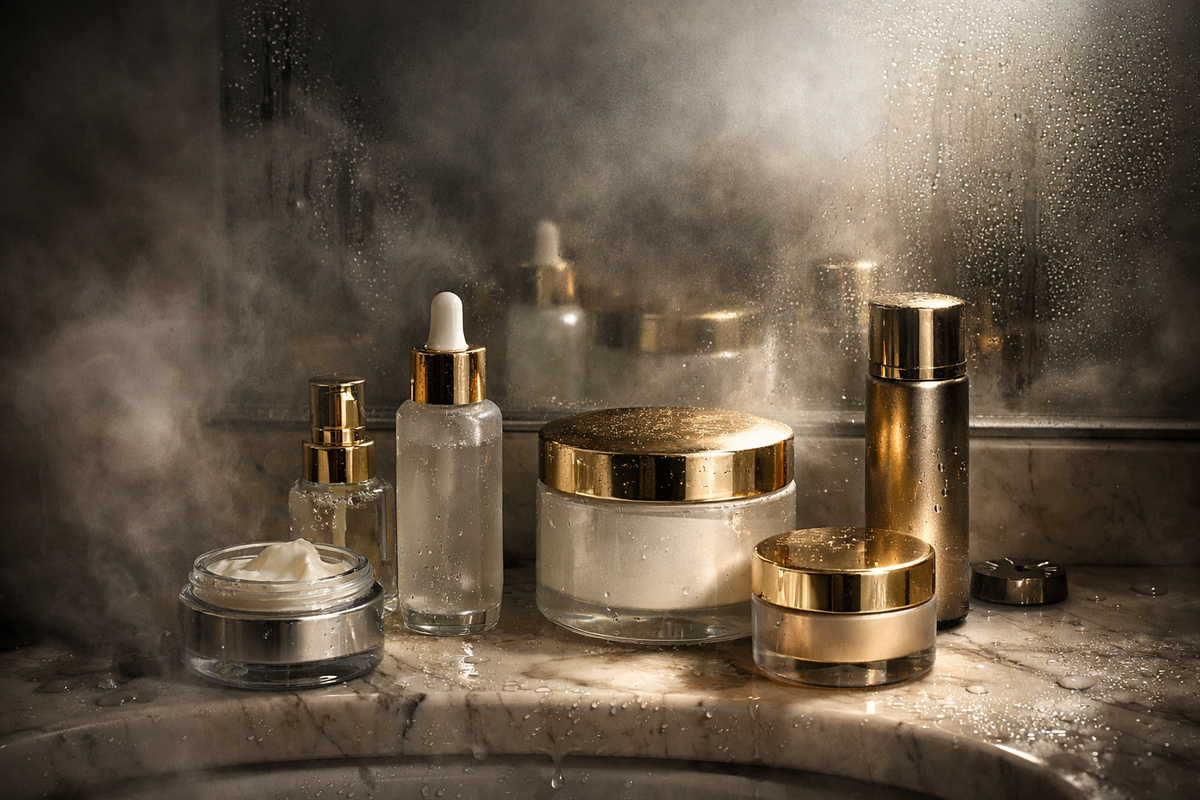 Ванная — это не домик для кремов. Это курорт для бактерий. Там постоянно меняется температура, влажно, горячий пар, потом холод, потом снова пар. А ещё конденсат попадает на крышки и горлышки.