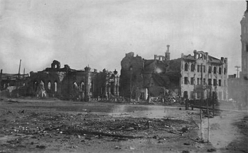 Слева развалины музея Сталина, справа трёхэтажный завод "Красная застава" (так называемый "гвоздильный"). Виден разрушенный угол здания, подорванный немецкими сапёрами.