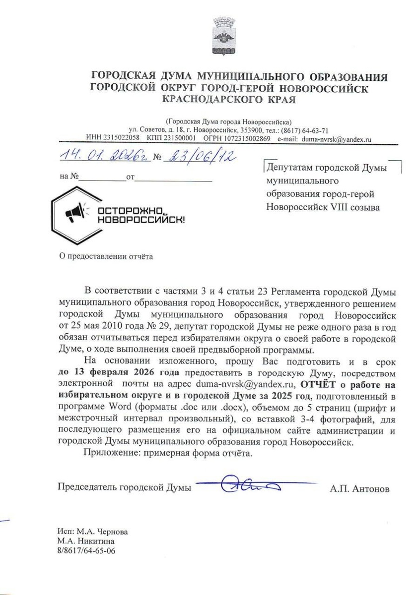 Председатель городской Думы Новороссийска Андрей Антонов обратился к депутатам VIII созыва с требованием подготовить годовые отчёты о своей работе. Речь идёт не о формальной справке, а о публичном отчёте перед избирателями за 2025 год. До 13 февраля депутаты должны рассказать, что именно они сделали на своих округах, как продвигались предвыборные обещания и чем запомнилась их работа в городской Думе. Отчёты планируют опубликовать на официальных ресурсах администрации и городской Думы. Также в документе говорится о специальных условиях для народных избранников до пяти страниц текста и несколько фотографий. Документы будут собираться централизованно через аппарат Думы. Осторожно, Новороссийск 📲 @nvrsk_online