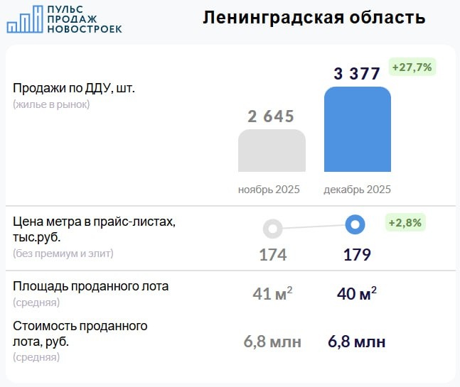 Декабрь 2025. Итоги продаж по ДДУ. 🏙 Сделки 3 377 сделок по ДДУ в декабре 2025 (+27,7% за месяц). 💰Цены и предложение На конец декабря средняя цена метра составила 179 тысяч рублей (+5 000 рублей за метр, без премиум и элит сегментов). На начало января (на сегодня) средневзвешенная цена метра не изменилась, 179 тысяч рублей. 🔸Цена метра в сделках с ДДУ выросла до 168 тысяч рублей (+4 тыс. рублей, +2,5%). Средний бюджет покупки остался таким же как и месяцем ранее, в среднем 6,8 млн рублей за лот. Средняя площадь проданного по ДДУ лота в декабре - 40 м² (-1 м² за месяц). 📈 Доля ипотечных сделок 75,0% (в ноябре было 68,0%). Смотрите детальные графики, топ девелоперов и старты продаж декабря на нашем сайте https://pulsprodaj.ru/news/dekabr-2025-leningradskaia-oblast/ 🔥 @pulsprodaj