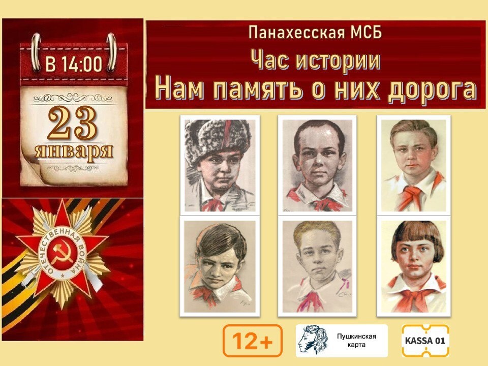 Час истории «Нам память о них дорога» 📆 23 января 2026 г. 🕙 14:00–15:15 📍 Панахесская МСБ Приглашаем на мероприятие, посвященное ребятам, которые за подвиги, совершенные в годы Великой Отечественной войны были удостоены самой высокой награды – звания Героя Советского Союза. В ходе встречи дети услышат истории о мальчишках и девчонках, их ровесниках, которые не только мечтали о мире, но и мужественно сражались за Родину в трудные времена. Мы расскажем о юных патриотах, таких как Лёня Голиков, Марат Казей, Валя Котик, Зина Портнова, Витя Новицкий и Володя Дубинин, ставших символами мужества и самоотверженности. Гости узнают о подвигах десятков тысяч детей, которые, не дожив до совершеннолетия, отдали свою жизнь ради Победы. В программе – слайд-презентация «Памяти юного героя-антифашиста», чтение стихов, посвящённых детям военной поры и обзор литературы у книжной выставки «Мы вечную славу солдату поём».