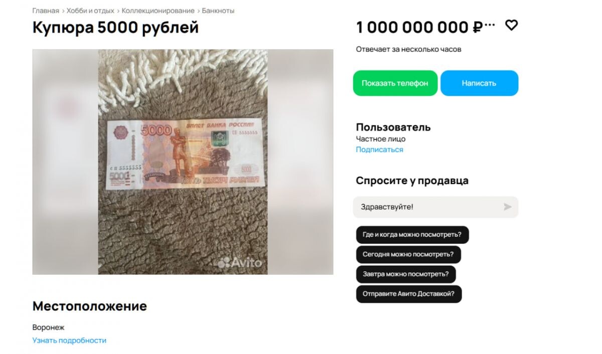 Необычное объявление появилось на популярной торговой площадке «Авито». Продавец из Воронежа просит миллиард рублей за банкноту номиналом 5000 рублей. Ключевой особенностью купюры, превращающей ее из средства платежа в объект коллекционирования, является её номер. Он содержит подряд семь цифр «5», что делает банкноту исключительно редкой и, по мнению продавца, «красивой». Согласно данным из объявления, банкнота была выпущена в оборот в 2020 году. Стоимость в 1 000 000 000 рублей делает эту купюру, пожалуй, самой дорогой пятитысячной банкнотой в истории России. Для сравнения, за запрашиваемую сумму можно приобрести несколько элитных квартир в центре Воронежа.
