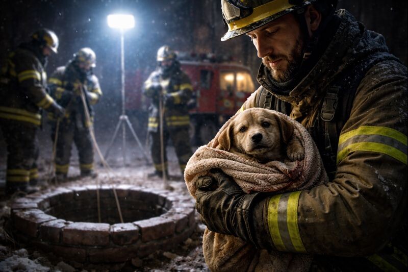Щенка завернули, как в кокон, и от него пошёл запах колодца — сырость, металл, холод. Но под этим запахом уже угадывалась жизнь: тёплое дыхание, мокрый нос, слабый, но упрямый хвост.
