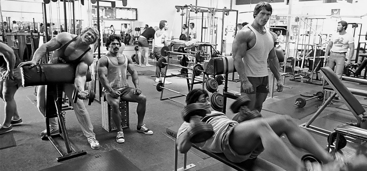 1970-е годы. Gold's Gym. Венис-Бич. Арнольд Шварценеггер — 7 раз Мистер Олимпия.