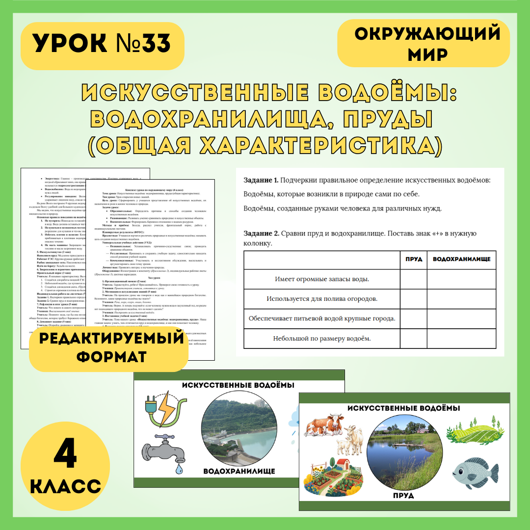 Тема водоёмов в 4 классе — это не просто изучение географических объектов. Это важный разговор о том, как человек преобразует природу под свои нужды и какую ответственность за это несет. Но как сделать так, чтобы дети не просто зазубрили определения, а поняли разницу в масштабах и назначении этих объектов? Чтобы ваш урок прошел динамично и продуктивно, я подготовила комплексный методический материал по теме: «Искусственные водоёмы: водохранилища, пруды (общая характеристика)». Конспект урока №33 построен на сравнении и поиске причинно-следственных связей. Мы предлагаем детям не просто слушать, а анализировать: зачем строить плотину на Волге и почему нельзя просто вырыть огромную яму для полива огорода? Что входит в методический комплект: Урок дополнен тематической физкультминуткой («Работает ГЭС», «Наполняем пруд»), которая поможет разрядить обстановку и закрепить новые термины через движение. Коллеги, вам больше не нужно тратить вечер на подбор картинок и составление рабочих листов. В