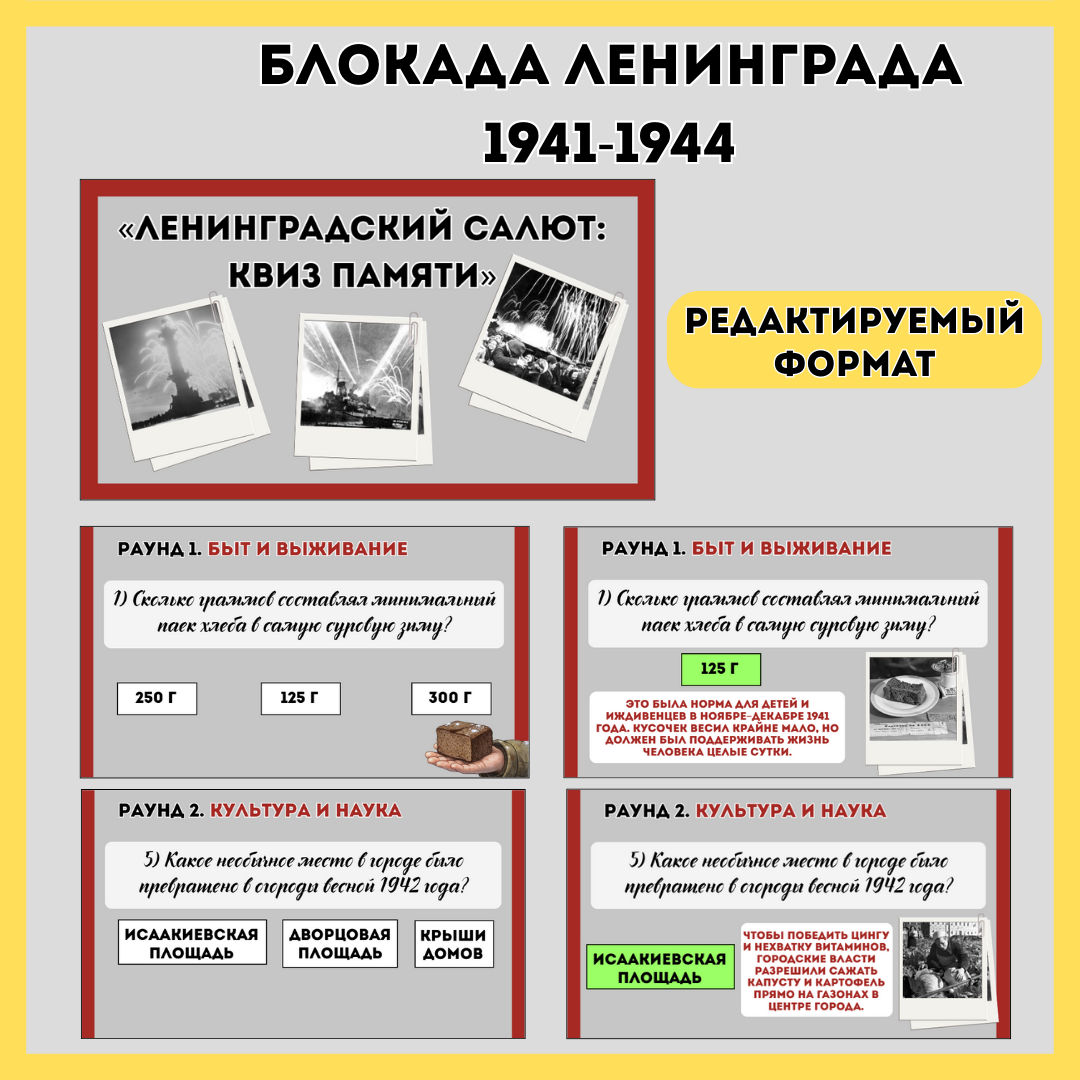 27 января — особая дата для нашей страны. День воинской славы, день, когда Ленинград полностью освободился от вражеской осады. Каждый год мы ищем способ рассказать детям о блокаде так, чтобы это не были просто цифры и факты, а чтобы история отозвалась в их сердцах уважением и гордостью. В этом году мы отмечаем 82-ю годовщину. Чтобы помочь учителям и классным руководителям провести по-настоящему глубокое и интерактивное занятие, я разработала специальный материал — Викторину «Ленинградский салют: Квиз памяти». Современным школьникам сложно воспринимать долгие лекции. Интерактивная игра позволяет им «прожить» историю, работая в команде. Квиз — это не проверка знаний на оценку, а путь познания через логику, сопереживание и поиск ответов на важные вопросы. Что включено в «Квиз памяти»: Скачивая этот материал, вы получаете полностью готовый сценарий внеклассного мероприятия. Вам не нужно часами искать проверенную информацию и подбирать иллюстрации. В комплекте идет подробный файл с вопросам