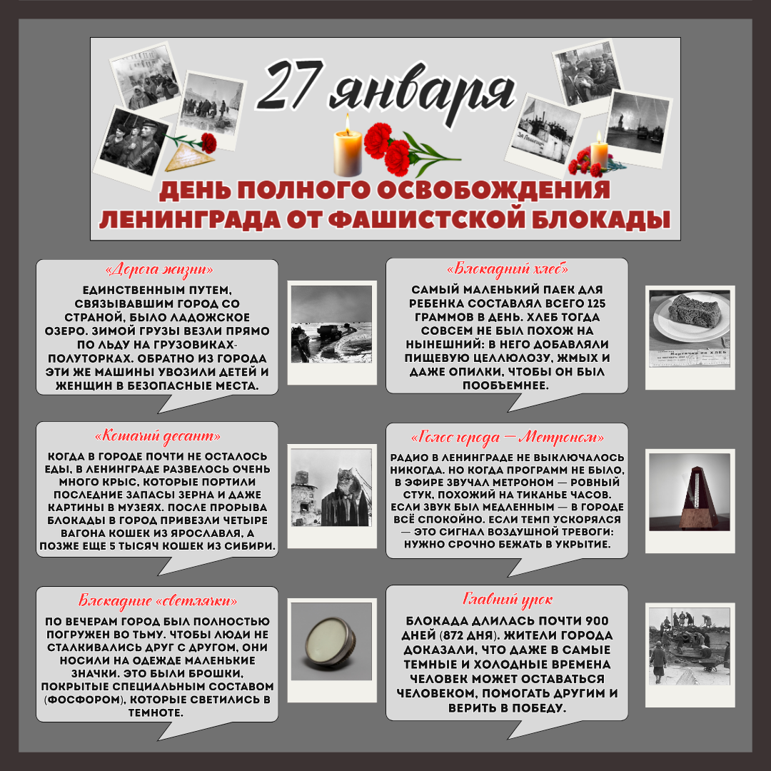 Приближается 27 января — одна из самых значимых дат в истории нашей страны: День полного освобождения Ленинграда от фашистской блокады. В школах по всей России пройдут линейки и классные часы. Перед каждым учителем встает задача: как оформить доску или классный уголок так, чтобы это не просто «заполнило пространство», а помогло детям прочувствовать масштаб подвига? Я подготовила готовый комплект материалов для оформления, который сочетает в себе визуальную лаконичность и глубокое информационное наполнение. Это не просто плакаты, а тематические карточки-факты, которые превращают обычный стенд в познавательную экспозицию. 1. Тематические блоки с ключевыми символами: 2. Визуальные элементы: