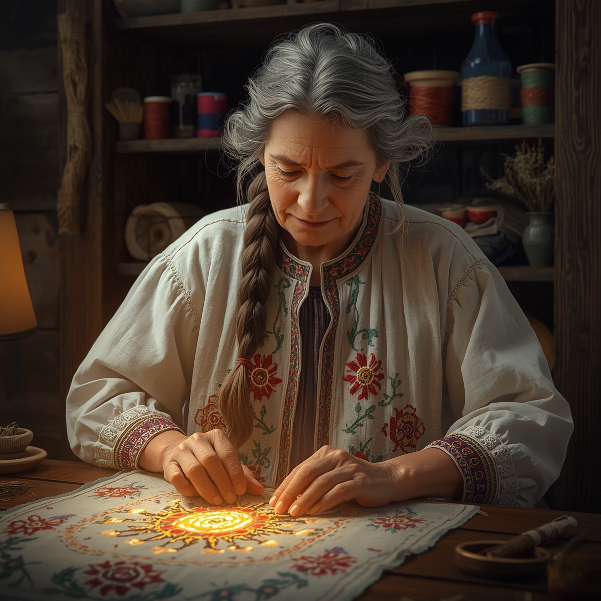 С того вечера сны её изменились. Ей снилось, что по её мастерской ходят тени предков в тех самых костюмах, что она сшила. Но на них узоры не вышиты, а выжжены печалью. И они молча показывали на свои пустые груди, где должно быть сердце, обережённое красным крестом-Алатырем. А в углу сидела её бабка, беззвучно двигая руками в ритме старинной песни, и в её пальцах рождался не стежок, а тонкая струйка света.
