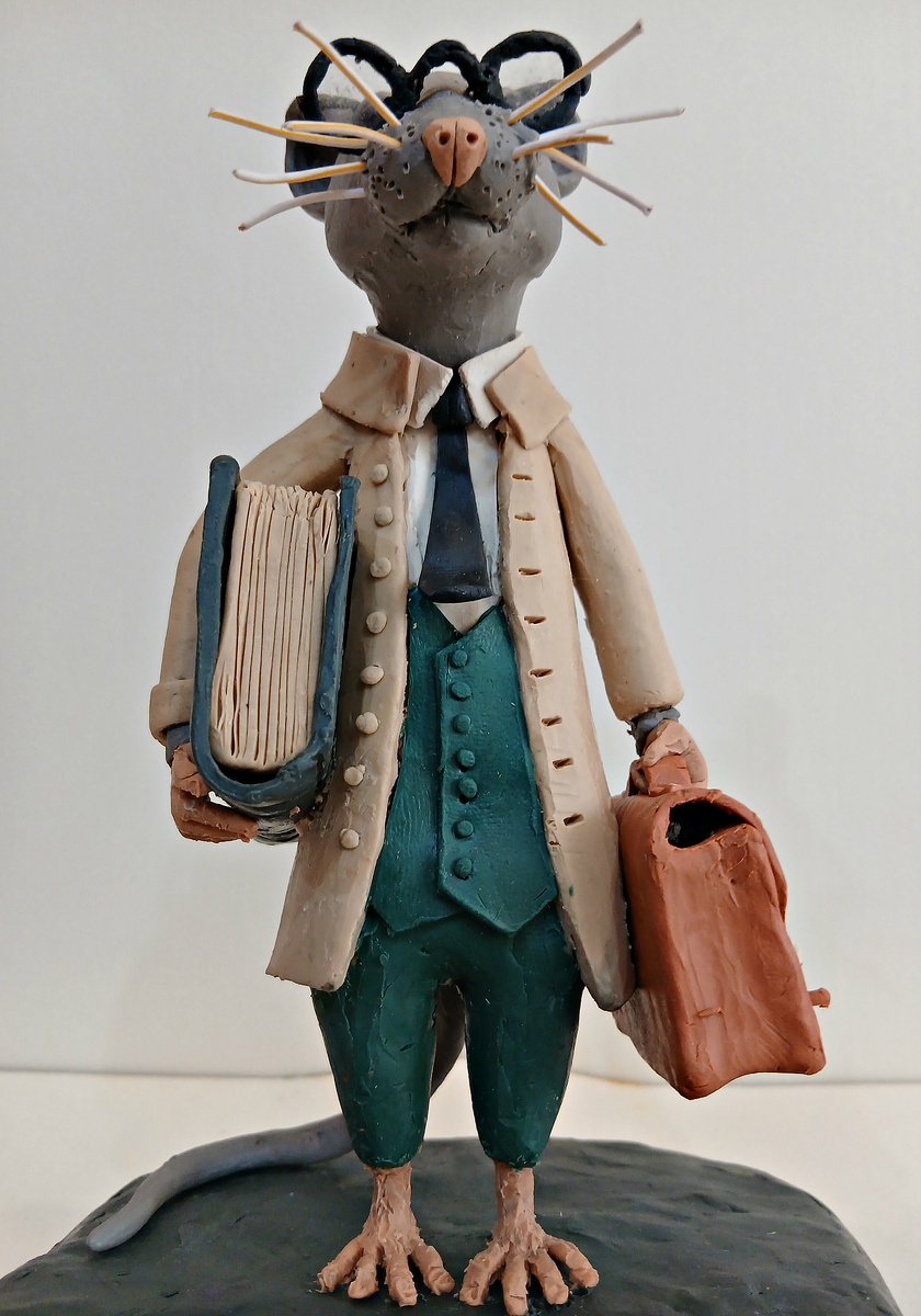 В последнее время моё внимание всё больше занимают фигурки людей и животных. И на то есть причина. В отличие от домиков, которые я делал ранее, последние занимают значительно меньшее место. Сегодня хочу представить своё очередное пластилиновое творение - «Учёную крысу». Не могу сказать, какую науку она представляет, тому помогло бы название книги, что крыса держит в своей лапке, но надпись стёрлась на кожаном переплёте старинного фолианта. Остаётся только гадать. И последнее, рост пластилиновой фигурки 15 см.