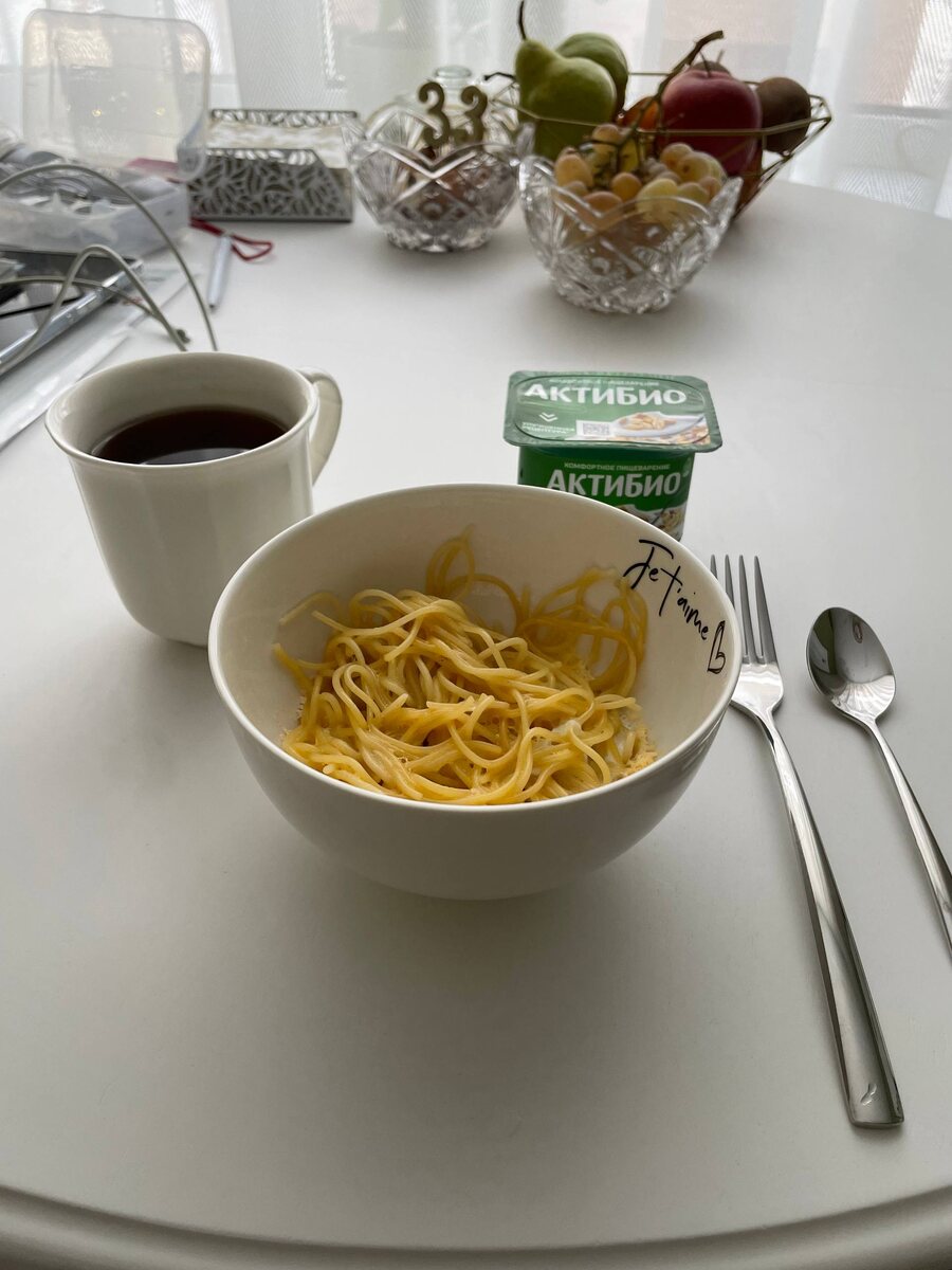 Вчера: на завтрак снова спагетти с яйцом)), йогурт, горсть винограда; позже был перекус яблоком и горстью орехов; на обед борщ со столовой