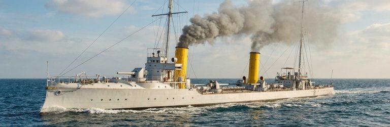 Идея данного крейсера возникла как вариант скрещивания «трехтысячников» с «китами». Пулеметов в итоге мы на него водрузили все-таки 4, а бортовые пушки ГК разместили эшелонно, чтобы и в направлении оконечностей по три ствола стреляло, и на каждый борт весь ГК при определенных условиях мог работать. Минные аппараты — 450-мм двухтрубные, от миноносцев типа «Циклон». Машины — две от реального «Новика», но с измененным распложением холодильников, чтобы втиснуть из бок о бок в более узкий корпус. В носовом и кормовом котельных отделениях котлы стоят по одному в ряд, а в двух примыкающих к машинному отделению — по два в ряд и чуть выше, сообразно необходимости поднять их к месту, где корпус наиболее широк. Итоговые совокупные ТТХ: по проекту – нормальное водоизмещение 1750 тонн, 85,5 м (длина по ВЛ)/87,0 м (длина наибольшая)/9,5 м (ширина наибольшая)/3,35 м (осадка при нормальном водоизмещении), 250/375 т угля (нормальный/полный запас), 8 котлов Шихау, мощность машин 11000 л.с., скорость 25