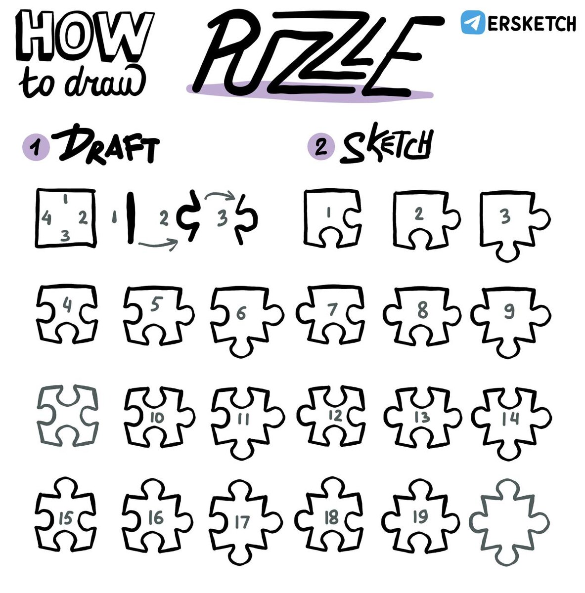 У детальки пазла четыре стороны. Каждая из них может быть либо плоской, либо выпуклой, либо вогнутой. Плоских сторон не может быть больше двух, так что их мы сразу отбросим. Деталей с двумя плоскими сторонами может быть три вида: выпукло-выпуклая, вогнуто-выпуклая и вогнуто-вогнутая. Одну из плоских сторон заменим по очереди на выпуклую и вогнутую. Получим ещё шесть деталей. Теперь у этих шести заменим последнюю плоскую сторону на выпуклую и вогнутую. Кажется, деталей со всеми выпуклыми и всеми вогнутыми не бывает, их уберём. Получится десять. В общей сложности у меня получилось девятнадцать видов деталей. Привет Стивену Кингу. Когда будете рисовать, обратите внимание, что края у выпуклой стороны немного вогнуты, а у вогнутой – наоборот, немного выпуклы. Это нужно, чтобы было больше места для дырок внутри детали.