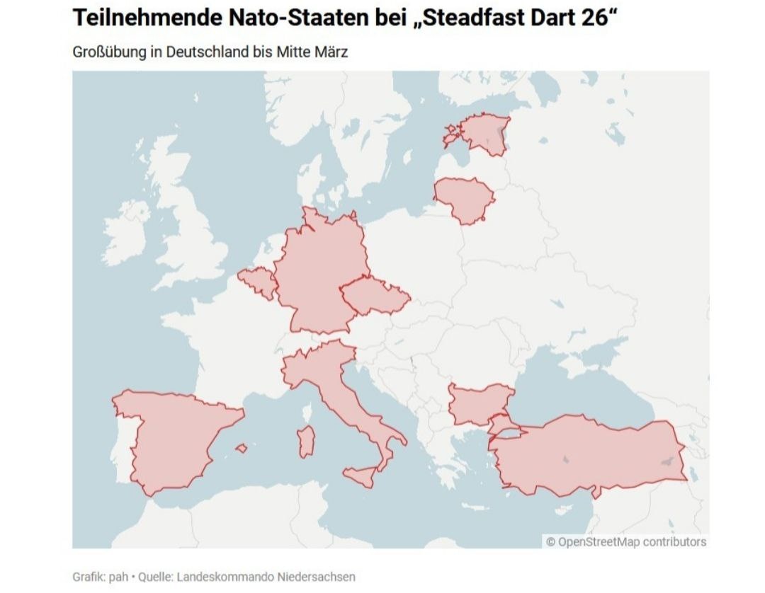 европейском континенте. В военных учениях «Steadfast Dart», которые продлятся до середины марта, будет задействовано более 10 тысяч военнослужащих из 11 стран – Германии, Италии, Франции, Британии, Испании, Бельгии, Чехии, Литвы, Болгарии, Греции и Турции. Главный логистический хаб – Германия. США в маневрах участия не принимают. К учениям Альянса привлечены сухопутные войска, ВВС, ВМС, а также кибервойска и космические подразделения. 🌐 За Русский Мир©Резервный📣Наш Чат✔️Подпишись‼️