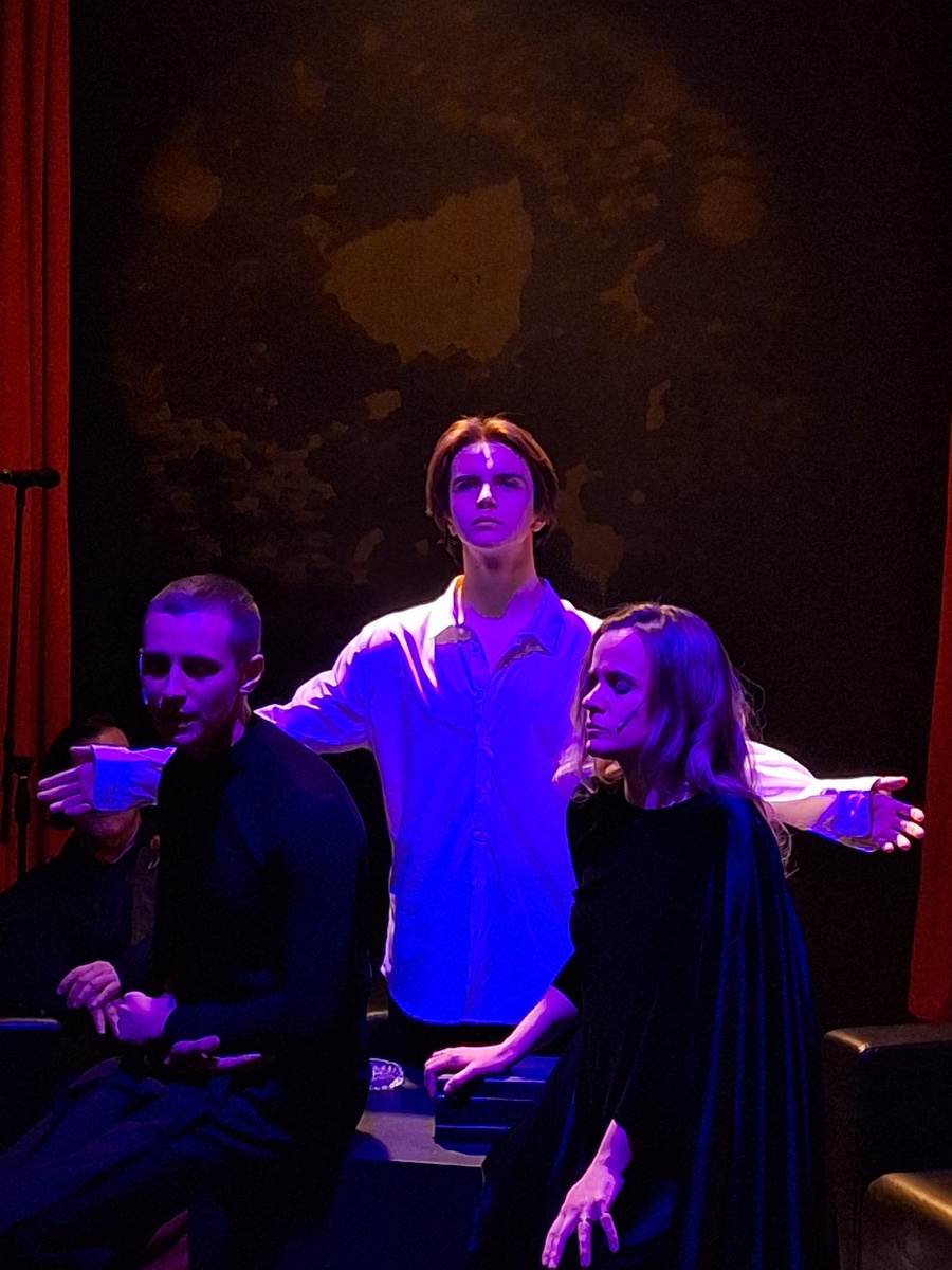 В спектакли были моменты, про которые было не ясно: то ли задумано так, то ли корректируют микрофон и наушник. Если последнее - получается, что и не страшно: мы ж "бесплатно на пресс-показ пришли" (это цитата режиссера перед спектаклем, если что).