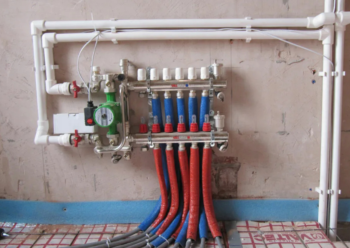 Эта информация будет полезна для тех, кто только собирается монтировать систему отопления. Допустим, у вас будет радиаторная система отопления. Но хочется, чтобы в санузле был водяной теплый пол. Как его подключить с минимальными затратами? Про этот момент вам может сообщить хороший мастер. Но промолчит тот, для которого нужно все сделать как можно быстрее и перейти на следующий объект. Напрямую водяной теплый пол подключить к трубе системы отопления не получится. Теплый пол – низкотемпературный способ отопления, температура полов должна быть комфортной, в него нельзя загонять +60 гр. Обычно, контура из труб в системе теплого пола подключают через коллектор с узлом подмеса и отдельным циркуляционным насосом. Горячий теплоноситель из двухтрубной системы отопления подходит к коллектору, смешивается с теплоносителем из обратки (из пола) до установленной температуры и подается в каждый контур. Такая схема подключения оправдана, когда у вас 4-5 контуров теплого пола (решили сделать его в ка