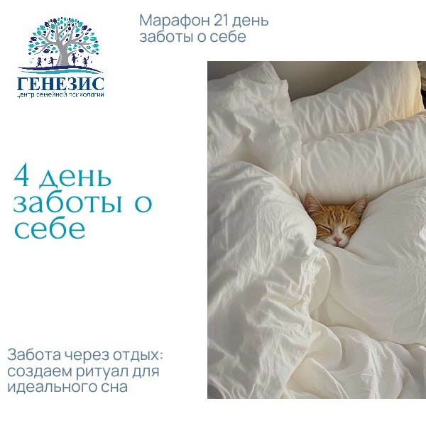 » День 4. Забота через отдых: создаем ритуал для идеального сна Добрый день, участники марафона! ✨ Мы постепенно наполняем свою «чашу заботы»: учились осознанности . Но сегодня мы подходим к краеугольному камню нашего благополучия — качественному сну. Забота о себе — это не только активные действия. Иногда самая большая забота — это позволить себе по-настоящему выключиться и восстановиться. Сон — это наш природный целитель, бесплатный косметолог и личный психотерапевт. День 4 — это день нежной гигиены сна. Мы не будем себя заставлять и ругать за недосып. Вместо этого мы по-доброму подготовим свое тело и разум к сладкому и глубокому отдыху. Почему это акт заботы? Во сне обрабатываются эмоции, стирается «ментальный мусор» дня. Восстанавливаются клетки, укрепляется иммунитет. Нормализуется уровень гормонов, отвечающих за настроение и аппетит. Ваш чек-лист заботы о сне сегодня: Начните вечерний ритуал «Для себя». Выделите 45-60 минут до сна как священное время только для вас. Не