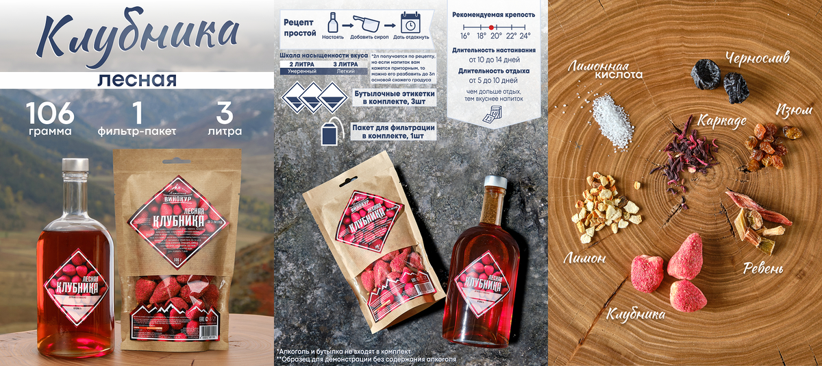 Описание: Этот набор создан для ценителей тонких, десертных ноток. «Лесная клубника» — это лето в бокале. Сублимированная клубника и чернослив дают насыщенный ягодный вкус, гибискус добавляет приятную кислинку и рубиновый оттенок, а цукаты ревеня и цитрусовые корки создают сложный фруктовый букет. В результате получается удивительно мягкий, сладковатый ликёр с длительным послевкусием лесных ягод и цитрусов — идеальный финал ужина или основа для изысканных коктейлей.