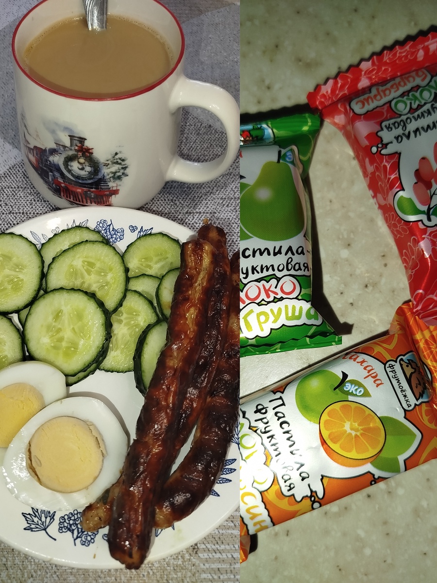 Завтрак: 3 колбаски с костра, яйцо, огурец, кофемолоко и пастила.