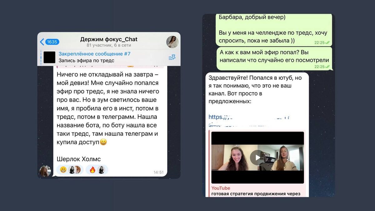 👍🏻 Одна из участниц клуба написала, что ей случайно попался мой эфир и она разыскивала меня по всем социальным сетям по имени и фамилии, которые высветились в зуме. Мне стало интересно, я написала в личку и спросила подробности. Выяснилось, что кто-то выложил мой эфир к себе на ютуб)) не указав авторство, просто человеку вот так захотелось, продвигать свой канал на моем контенте) Как видите на скринах, такое не работает 😁 А у вас воровали что-нибудь? Как к такому относитесь?
