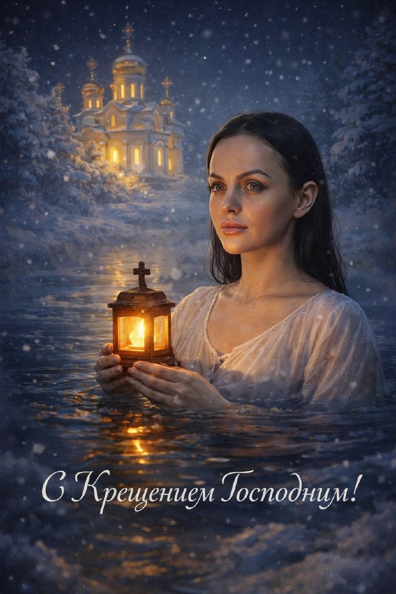 👉 Создать в 1 клик (для женщин, если нужен для мужчин, то используйте промт ниже и правьте ПОЛ) Модель: Image 1.5 Промт: Крещенское купание, женщина в воде, свеча и ночной храм Используй референс личного портрета женщины: РЕФ_ЖЕНЩИНА_1. Полное сохранение лица, без изменения возраста, естественная кожа. Сцена: крещенское купание в проруби, женщина по грудь в воде, на плечах светлая рубашка из тонкой ткани, аккуратно и целомудренно, без провокаций. В руках деревянный ковш или маленький фонарь со свечой, тёплый свет отражается на воде. На заднем плане ночной зимний храм с мягкой подсветкой, снежные деревья, лёгкий туман над водой. Стиль: праздничная открытка, живописная иллюстрация с красивым светом, детальная вода, пар над прорубью, эффект зимней сказки. Композиция: женщина по центру, храм на фоне, сильный контраст тёплого света свечи и холодного синего снега, аккуратная виньетка. Текст: вверху или внизу аккуратная каллиграфия, строго так: “С Крещением Господним!” Текст не перекрывае