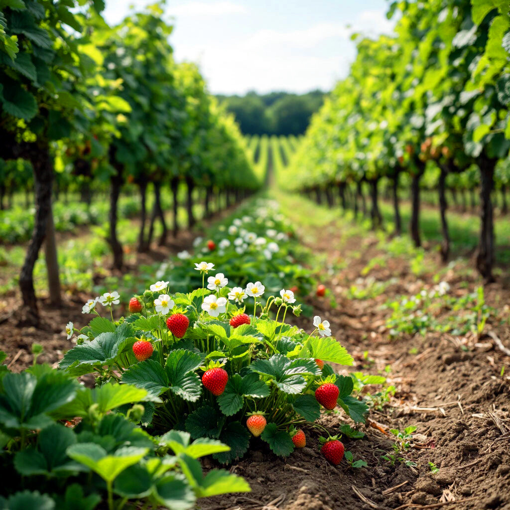 - земляника и клубника — корни находятся на разной глубине, поэтому конкуренции нет. Многие практикуют этот вариант. Когда-то и я этим занимался, но со временем мне надоело осторожно ходить в виноградных междурядьтях, боясь повредить ккустики клубники, и я отказался от такого решения.